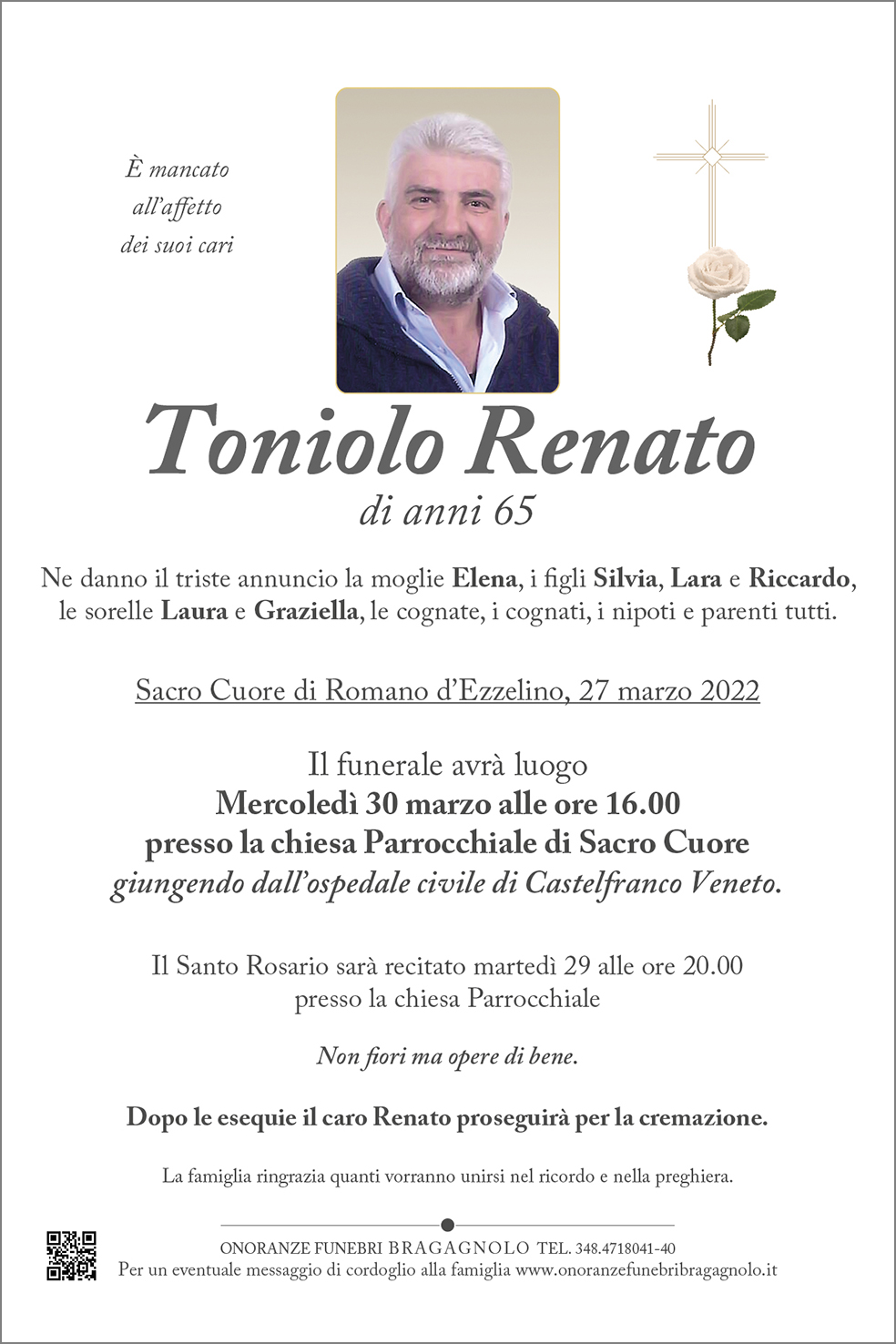 Il funerale avrà luogo Mercoledì 30 marzo alle ore 16.00 presso la chiesa Parrocchiale di Sacro Cuore