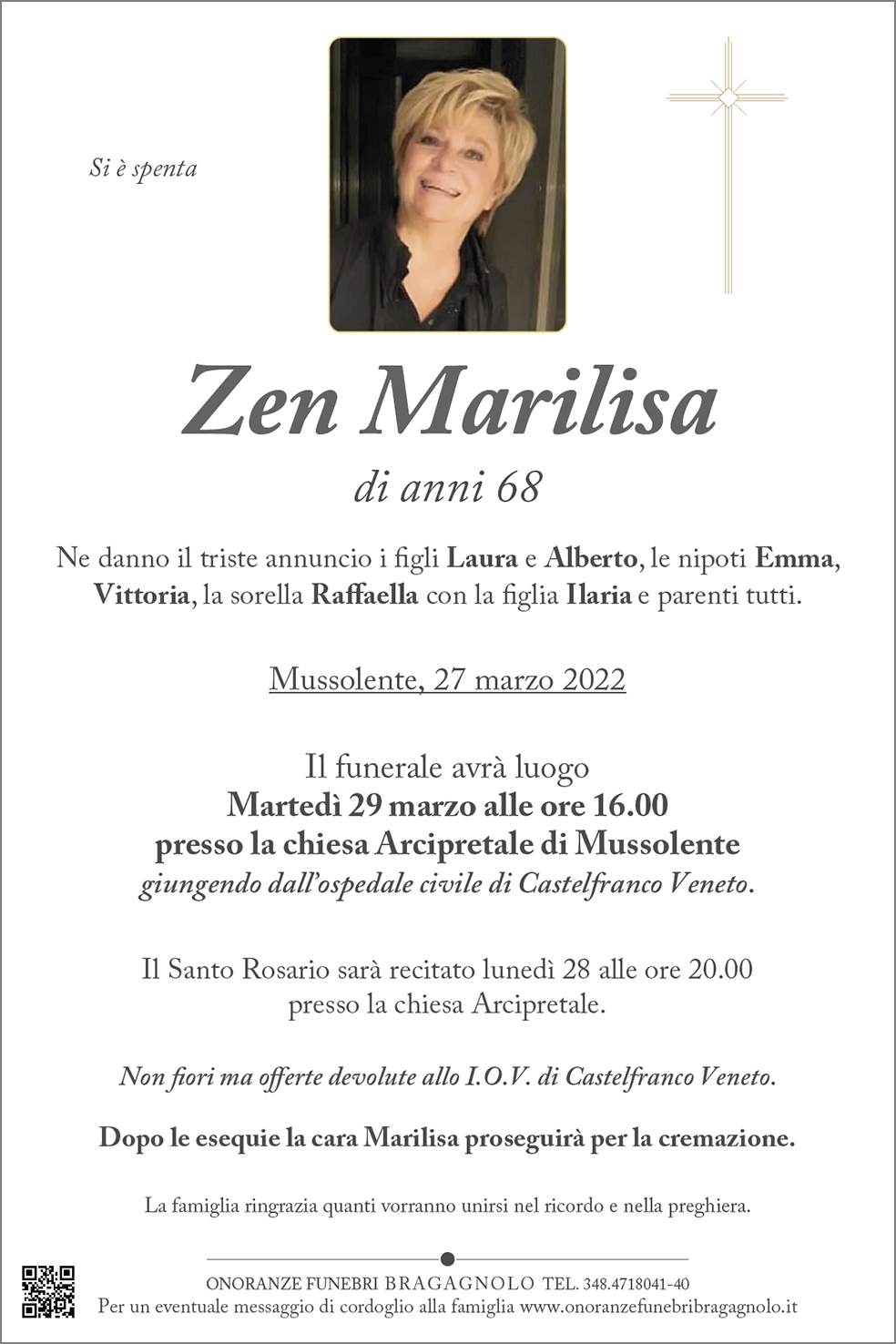 Il funerale avrà luogo Martedì 29 marzo alle ore 16.00 presso la chiesa Arcipretale di Mussolente