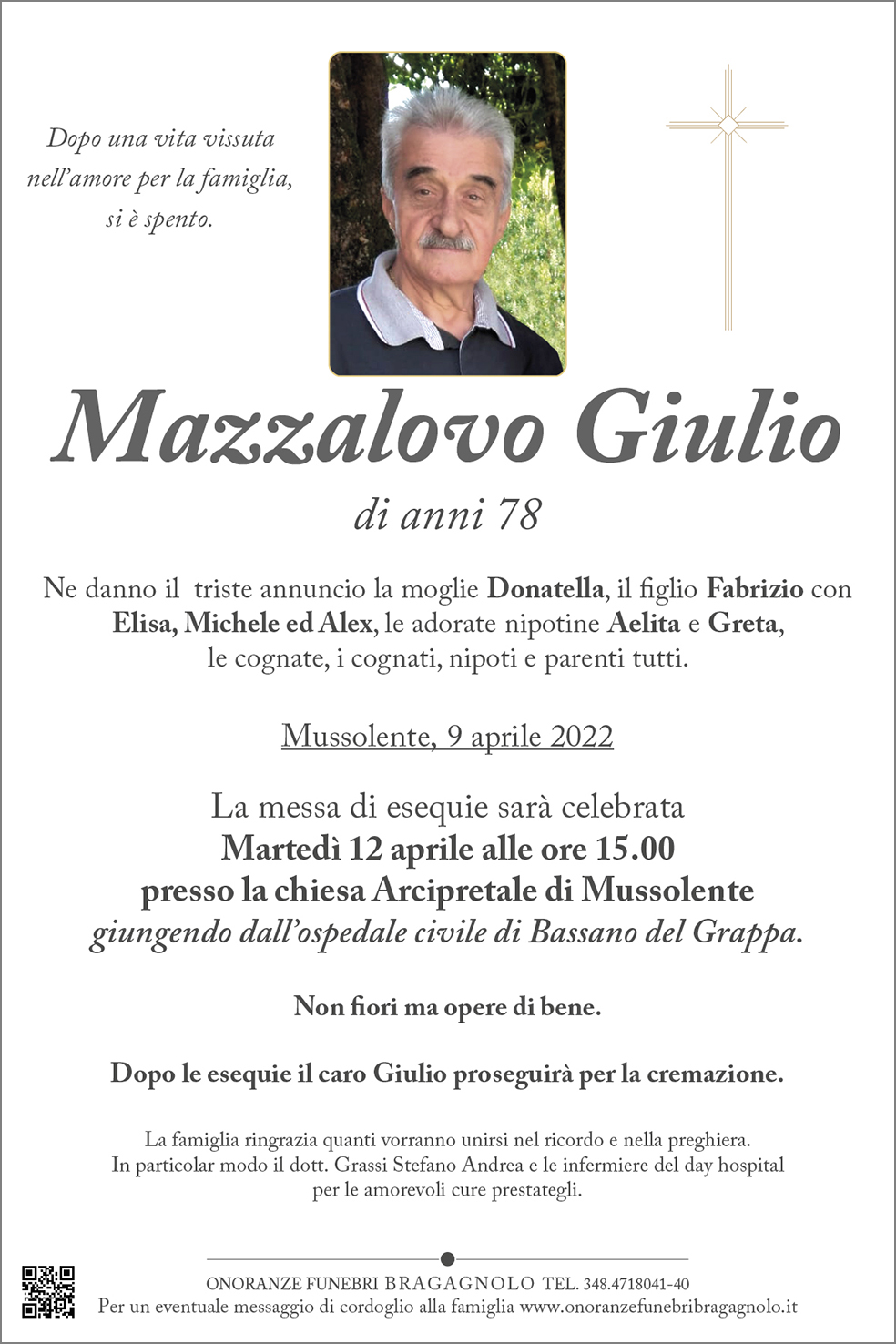 La messa di esequie sarà celebrata Martedì 12 aprile alle ore 15.00 presso la chiesa Arcipretale di Mussolente.