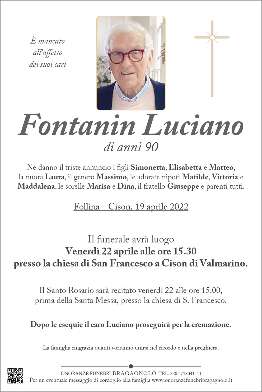 Il funerale avrà luogo Venerdì 22 aprile alle ore 15.30 presso la chiesa di San Francesco a Cison di Valmarino.