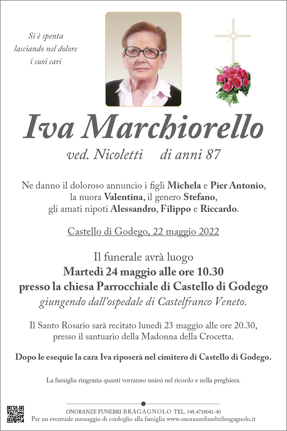 Il funerale avrà luogo Martedì 24 maggio alle ore 10.30 presso la chiesa Parrocchiale di Castello di Godego.